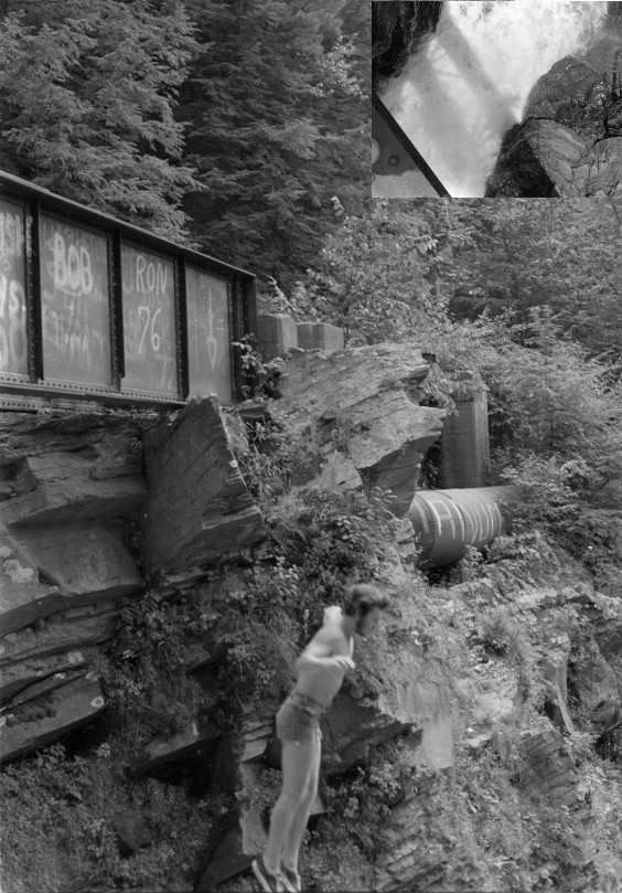 I started photographing the Powder Hole about 1975 with a 35mm camera. The summer of '76, just before I started my first year at Penn State, I practically lived there. My favorite thing to do was to jump off the trestle into the creek 50 feet below, scamper to the left side (looking downstream) and make my way back beneath the falls and come out on the right hand side. It was exhilarating. I would do it multiple times a time, laying on a narrow trestle beam to catch some rays and warm myself between jumps. Here I am jumping off the trestle that summer.