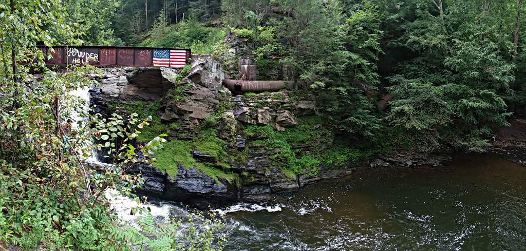 As kids we knew the Powder Hole as a place of mystery and adventure. The dilapidated stone buildings, the rusting bridges, and the roads and railroad tracks overgrown with trees and grass were an irrestible attraction. In the early 60s as a kid we would visit there from the more easily accessible way. We would park by the road leading up from Wapwallopen and pull off close to Wapwallopen Creek, which was possible in those days. (I even remember an uncle parking so close he could wash his car.) We would then walk up to what I refer to as the Third Falls, the falls where the trestle crosses the creek an estimated 50 feet above the bottom of the falls.